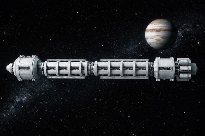 | <構成> ●船体前部 指令モジュールと居住モジュールで構成される。 居住モジュールは、オペレーターが寝泊まりする個室、酸素/水/食料品等の生活必需品を収納する。 ●船体中央部 船体構成用剛性フレームと船体後部へ移動するためのパイプスペースのみで構成される。 剛性フレームは、標準型25メートルコンテナ(上記図の中央)に合わせて設計されているので、剛性フレームの外側にハードポイントを取り付ける事で コンテナの接続が可能。1つの剛性フレームには4つのコンテナが接続可能である。 最大構成では5つの剛性フレームを接続可能であり、最大20個のコンテナを輸送することができる。 ●船体後部 推進剤タンクモジュールと推進システムモジュールで構成される。 推進剤タンクモジュール、推進システムモジュールについては、1.旅客輸送用シャトルと同様に構成の選択が可能。 |