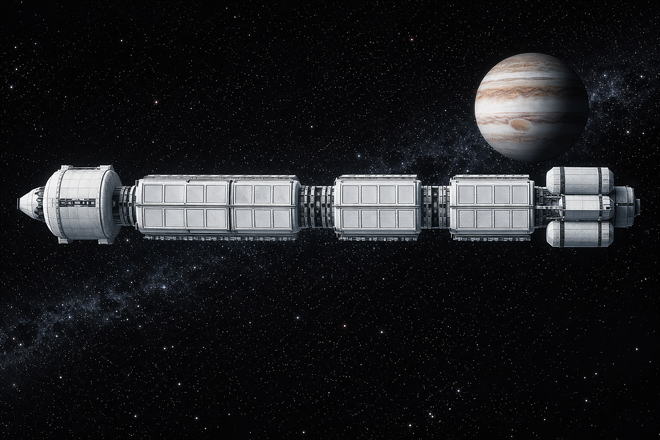 | <構成> ●船体前部 指令モジュールと居住モジュールで構成される。 先頭に接続された指令モジュールで船全体の操作を行う(2人のオペレーターが操作する想定だが、無人での運用も可能) 指令モジュールに接続した居住モジュールには、乗客用の荷物置き場、食堂等を設置する。収容人数に応じて1つ~3つ接続する。 ●船体中央部 船体構成用剛性フレーム(宇宙船の図左下)、旅客用モジュール(宇宙船の図右側)で構成される。 旅客用モジュールは最大40人が収容可能で、独立した空気/水リサイクルシステムと動力装置を持つ。 ※上記の図は80人搭乗する想定であるが、最大構成では旅客用モジュール5つ構成で200人搭乗が可能 ●船体後部 居住モジュールと推進剤タンクモジュール、推進システムモジュールで構成される。 居住モジュールには乗客用の貨物に加えて、酸素/水/食料等の生活必需品を収納する。収容人数に応じて1つ~3つ接続する。 推進剤タンクモジュールは、1つ~3つ接続が可能。上記図の推進システムは燃焼式(酸素/メタン)推進システムを選択。 |