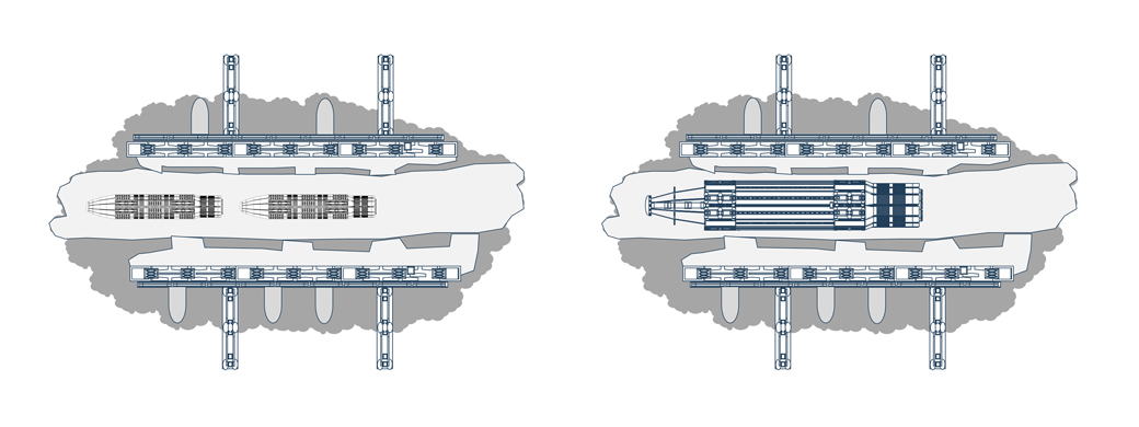 下の図にて、強襲揚陸艦、恒星間宇宙船プロトタイプが建造されたときの建造ドックの状態を示します。
