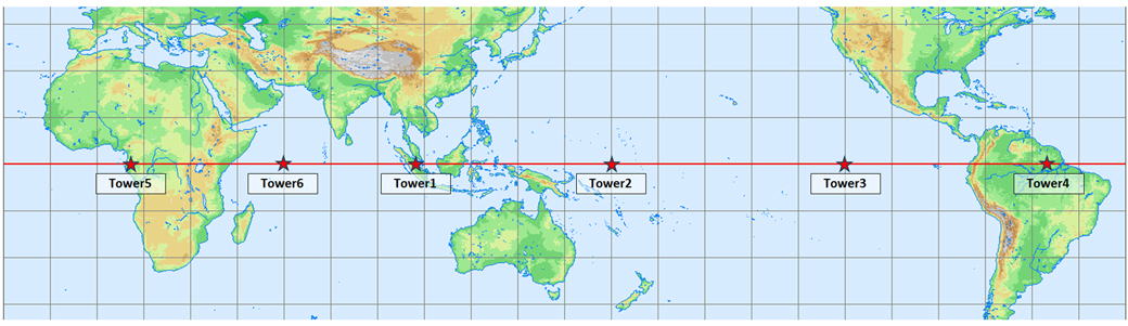 | <静止軌道エレベーターの配置> ●Tower1 : インドネシア、スマトラ島 ●Tower2 : 太平洋、東経165度海上(海上プラットフォーム) ●Tower3 : 太平洋、西経120度海上(海上プラットフォーム) ●Tower4 : ブラジル北部、パラー州 ●Tower5 : アフリカ、ガボン ●Tower6 : インド洋、東経60度海上(海上プラットフォーム) |