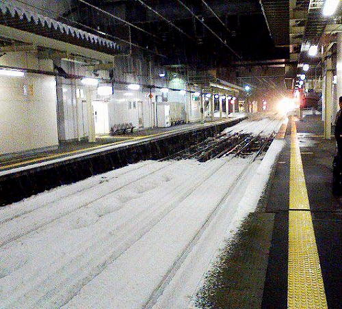 月曜日夜中に移動したとき、やってくる急行電車の写真を撮りました。まさに雪国の風景ですね(^_^;