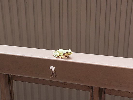 昨日の雨で少々ひんやりしている空気。ふと窓の外を見たら庭の柵の上に小さなカエルがいるのを見つけました。