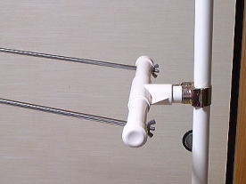 2.ボディアーム ボディを支えるための部品を取り付ける 右は支柱に取り付けた状態 (部品明細) ○ パイプ(小) : 310ミリ × 1 ○ パイプ(短) : 60ミリ × 1 ○ ターンバックル(金属製) × 1 ○ T字ジョイント × 1 ○ キャップ × 2 |