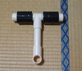 1.支柱 ボディ自体を支えるための部品を取り付ける 一番メインとなる部品 右は、各部品を取り付けた状態 (パーツ明細) ○ パイプ(長) : 1235ミリ × 1 ○ パイプ(中) : 450ミリ × 1 ○ パイプ(小) : 445ミリ × 2 ○ T字ジョイント × 1 ○ L字ジョイント × 2 ○ キャップ × 3 ○ ストッパー × 2 |
