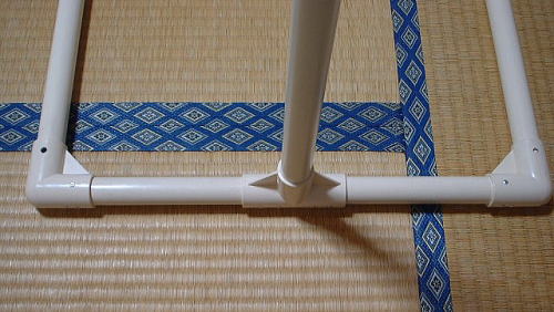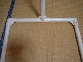 450ミリに切断したパイプの中央に T字ジョイントを取り付けます(まだ接着しない事) パイプの両端にはL字ジョイントを取り付けます 両端のL字ジョイントには先ほど作成した 445ミリパイプを取り付けます 完全に平らな面(フローリング床など)に 置いた状態で、450ミリパイプと両端の L字ジョイントを接着します (445ミリパイプとは接着しません) |
