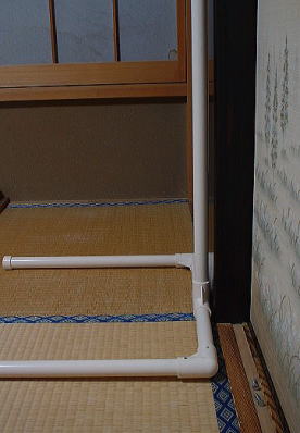 T字ジョイントを接着します 450ミリパイプの中央に接着します 接着するときには、壁や柱など 垂直になっているところを使用します 図のように、T字ジョイントにパイプを取り付けて パイプを壁などに固定するとよいと思います 固定できたところで、T字ジョイントと 1235ミリのパイプを接着します (力のかかる部分なので、完全に接着させる事) |
