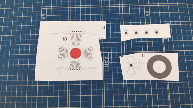 台紙から切り取ったのが下の画像になります。噴射ガス保護パネルは細かい部分が多いのでデザインナイフの助けを借ります。