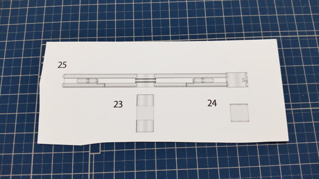 着陸脚は可動するようになっていて、向かって右側の部品は可動部分の関節の箇所に取り付けるパイプ状のものです。