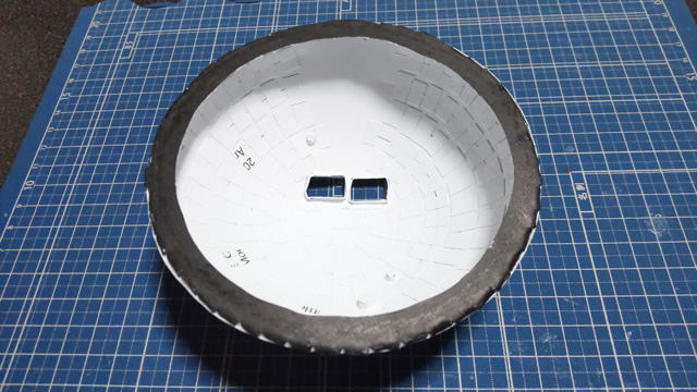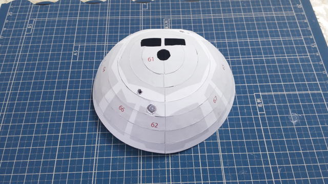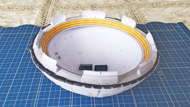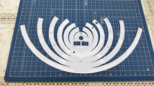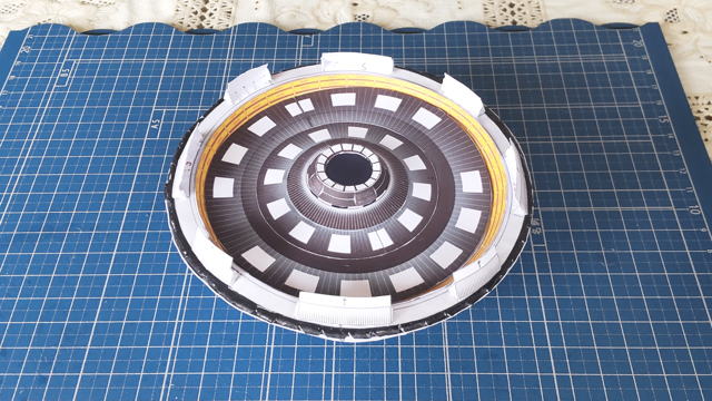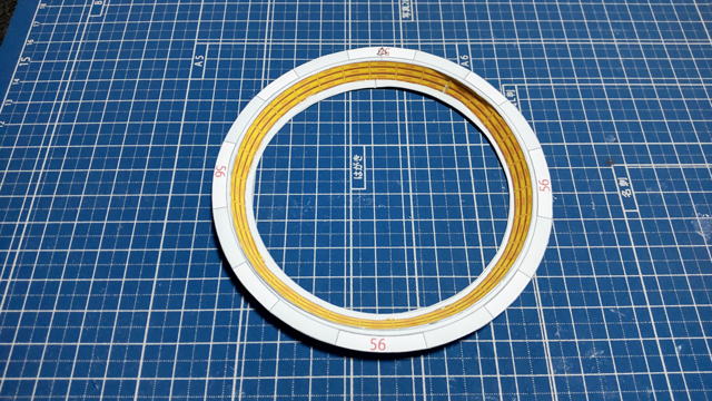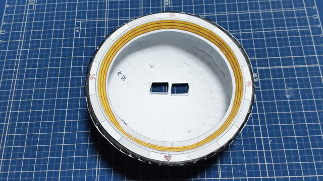 リング状の部品3つを組み立てると下の画像となります。ぺらぺらの紙ですが接着すると堅固な部品になります。