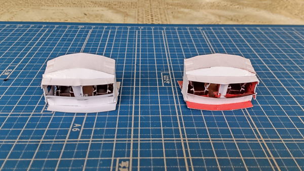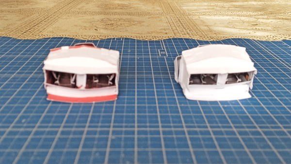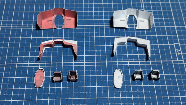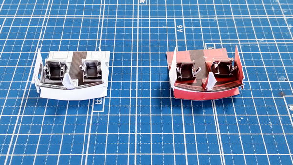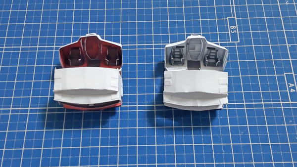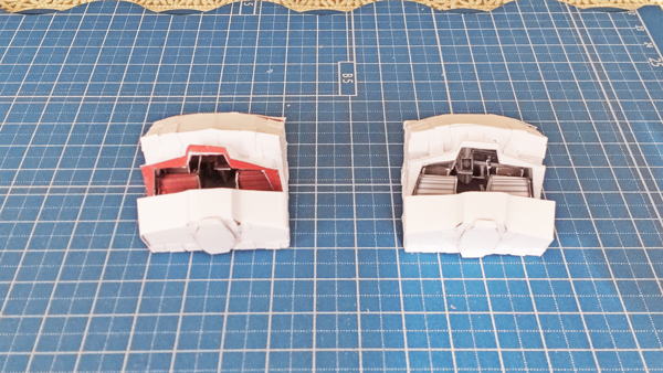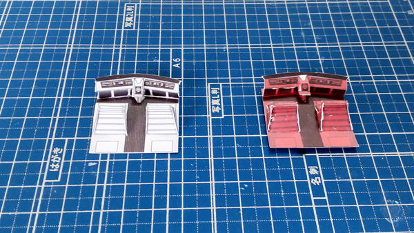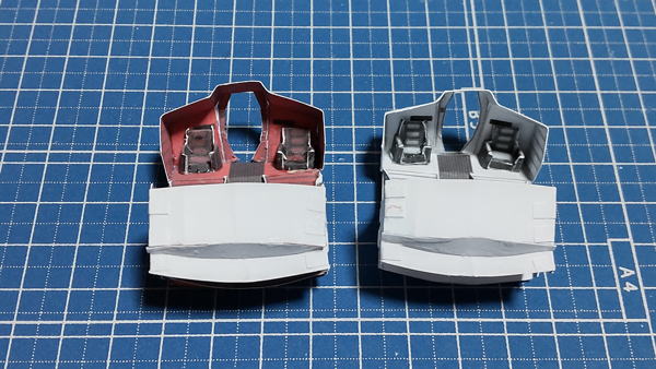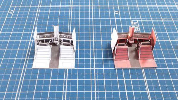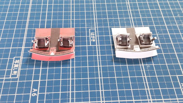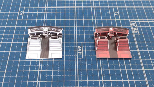 白色灯と赤色灯のコクピット両方を並べています。まずは床にパイロット席を支える部品の取付したのが左の画像。