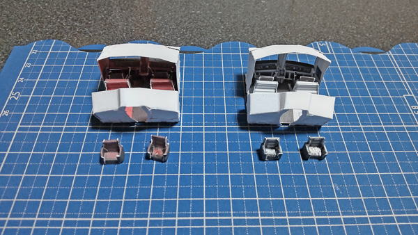 まずはコクピット後部を取付したのが左の画像、そしてコクピット後部に客席乗務員の座席を取付したのが右の画像になります。