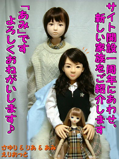 ( 2004.03.08 ) えりおっとさんのお宅に家族が増えました。 あみさんです。こちらこそよろしくです(^_^; お兄さんは、あみさんと前にあったことがあるの? なんだかそわそわしているけど。 う〜〜〜〜ん、似たような娘さんには会ったことが(^_^; なんかぐっとくるものがありましたね。 ほほぉ、なんか悪いこと考えているね。 3姉妹に悪いことしちゃいけないよ。 いやぁ、そんなことは全く考えていないデス。 毎週末は、オイシイ姉妹丼で・・・・・違うか(^_^; これからもみなさん仲良くね(^_^;/ |