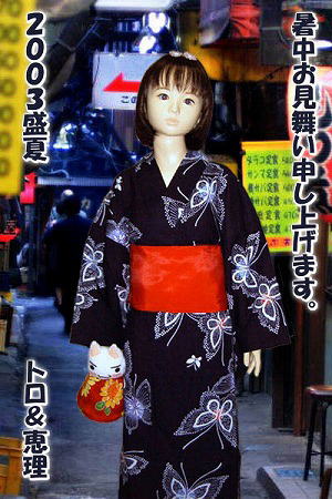 ( 2003.08.01 ) 暑中見舞いどうもありがとうございます、トロさん。 恵理さんの浴衣姿も涼しそうですてきですね。 ようやく夏らしくなりましたね。 8月はお祭りとか、花火大会とか、イベントがあって 楽しいですよね(^_^; 恵理さんの周りの風景もなんだか親しみありますね。 何とか定食とか・・・・・・。 これって、姉さんにもなじみのある風景とか。 そうなんだよね〜♪(^_^; ビールとか、サワーとか、日本酒とか、 枝豆に・・・・・・・、って、おいおい(^_^; |