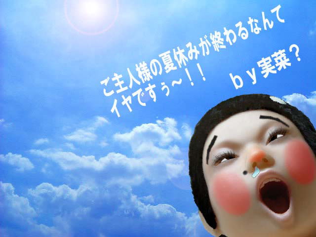 ( 2004.08.18 ) 暑いですね、今年の夏は特別に暑かったですが 残暑見舞いをどうもありがとうございます(^_^; 夏ももうすぐ終わりなんですね、始まると本当に終わるのは早いんですね。 お、直子さん、今日はずいぶんとまたマジメなコメントですね。 何かあったんですか?(^_^; いやぁ・・・・・・・秋になると食欲が出て太りそうなんで・・・・・。 う〜〜〜〜ん、相変わらず意味不明なコメントね。 体調崩さないように実菜さんも気をつけてくださいね(^_^; |