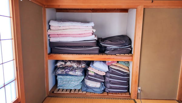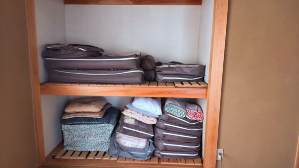 寝具や座布団は専用の袋の中に収められていて、いちおうきちんと整理されています。
