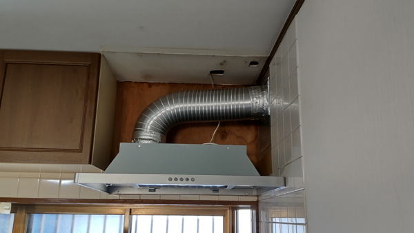 壁の排気口の取りつけが完了し、レンジフードと排気口の間にダクトが取りつけられた状態です。