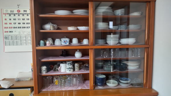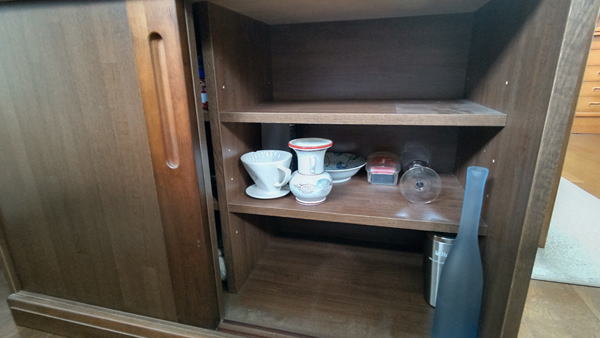 四番目の画像は、食器棚の状況です。皿やコップ類を出したのでかなり空きスペースができました。