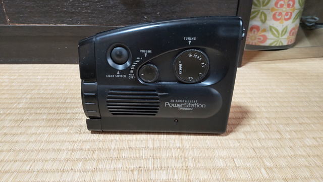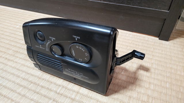 何かの景品かなにかで貰ったと思われる、手動発電機つきのライトつきラジオ(またはラジオつきライトなのか)です。