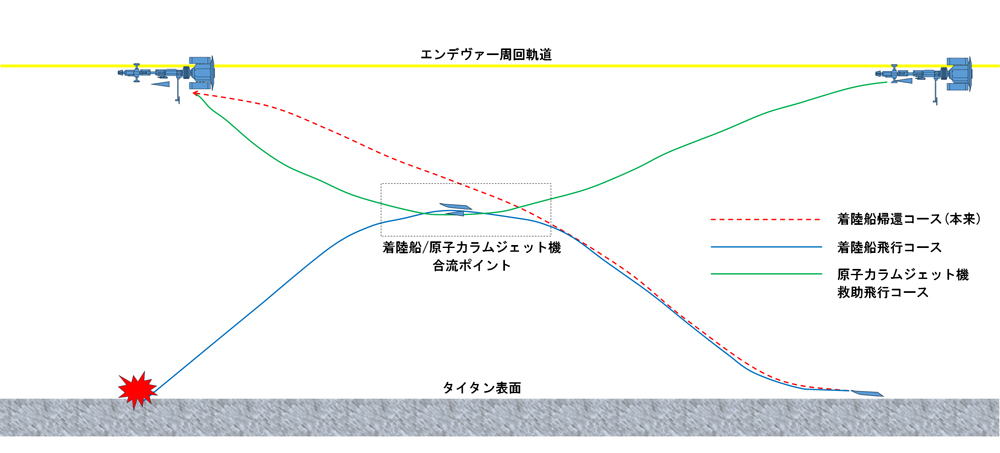 〇青色実線 : 救出作戦時の、着陸船の飛行コース。帰還に必要な速度を得る事ができず、タイタンに墜落する。