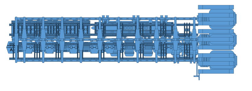 ●資材輸送用超大型キャリアー 図は、中核ブロック、旅客ブロック、物流用ブロック一式の 輸送時の状態を示す <詳細スペック> 資材輸送用超大型キャリアーの詳細は以下参照 資材輸送用超大型キャリアー ※別窓で開きます |