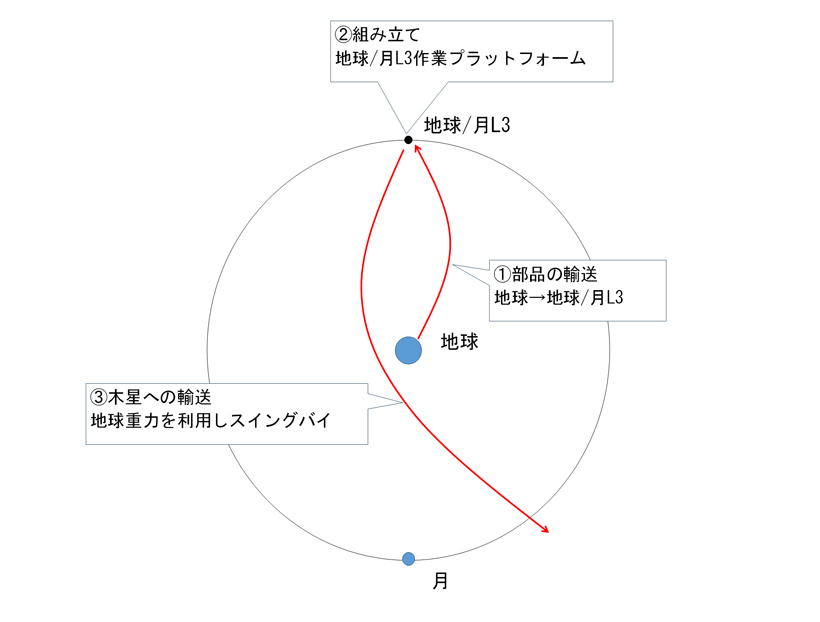 <第一段階> 部品の輸送 地球から、地球/月L3の作業プラットフォームに部品を 輸送する <第二段階> 組み立て 地球/月L3の作業プラットフォームにて 部品の組み立てを行う <第三段階> 木星への輸送 資材輸送用超大型キャリアーに作業プラットフォームを 搭載し木星へ向かう 出発時には地球重力を利用したスイングバイを行い 予備加速および木星への進路調整を行う ※図は一例として示した軌道であり、常にこの軌道とは 限らない |