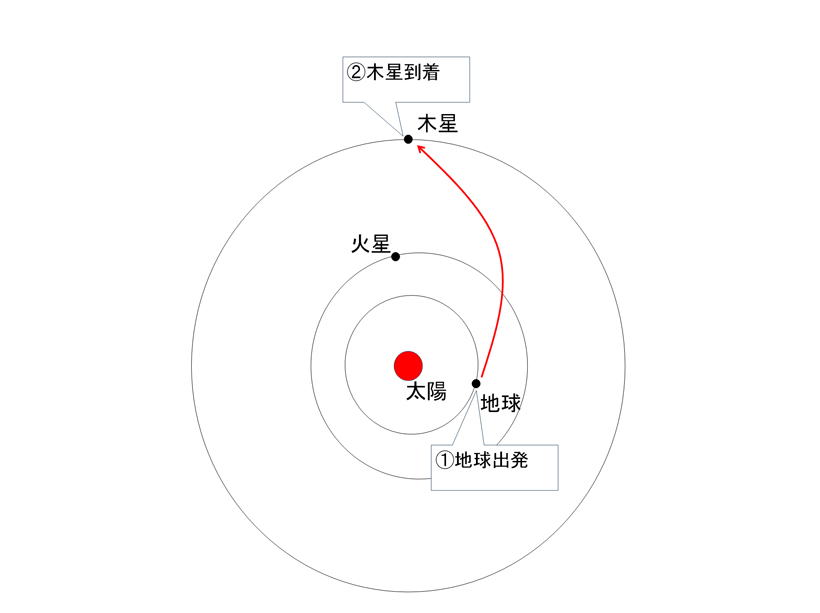 木星への航路を示す 地球を出発後、木星への加速を行い、1年前後で 木星へ到着する ※図は一例として示した軌道であり、常にこの軌道とは 限らない |
