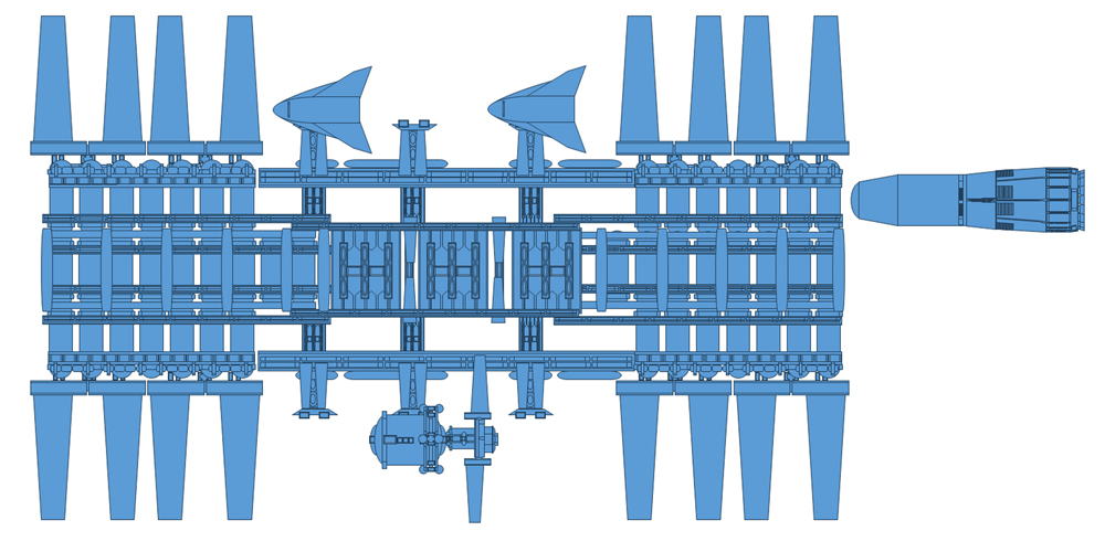 | <パターン2:貨物積み替え/燃料補給基地> ●用途 コンテナ船、タンカー、資材輸送用宇宙船のための中継基地。貨物の積み替えや、宇宙船に対する燃料補給を行う。 ●機能 ・宿泊設備 ・屋外/屋内作業スペース ・シャトル用ドッキング通路、貨物船用ドッキング通路 ・貯蔵タンク群(水、酸素、水素、メタン、核融合燃料等) ・動力設備(原子炉、太陽光パネル等) |