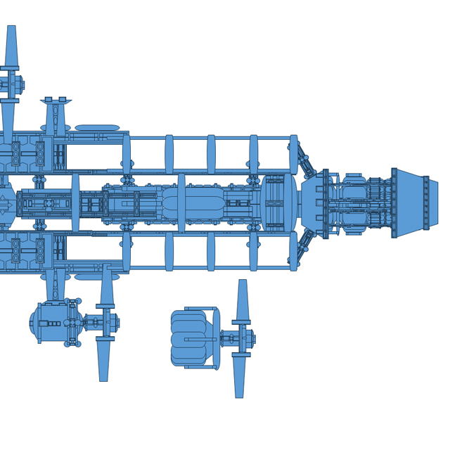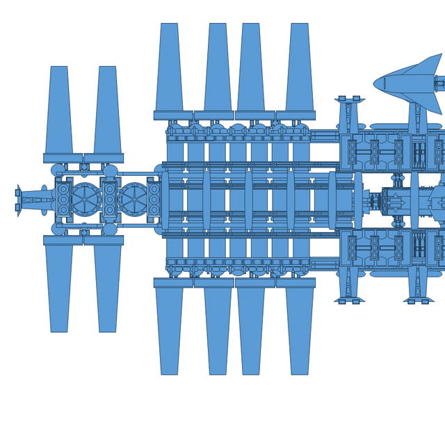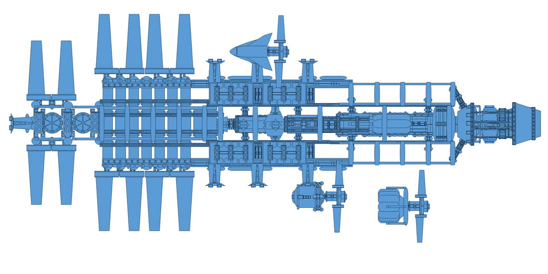 ●居住区画 ・作業員用宿舎 ・休憩室、アスレチックルーム ●管理区画 ・中央制御室 ・管理者室、会議室、通信室、制御システム ●動力区画 ・原子炉 ・ラジエーターパネル ・太陽電池パネル ●貯蔵タンク群 ・酸素/水素/メタン貯蔵タンク ●生産区画 ・水、空気リサイクルシステム ・廃棄物再利用/食料生産システム ●旅客区画 ・ホテル設備 ・到着/発着ロビー ・宇宙船ドッキング用通路 |