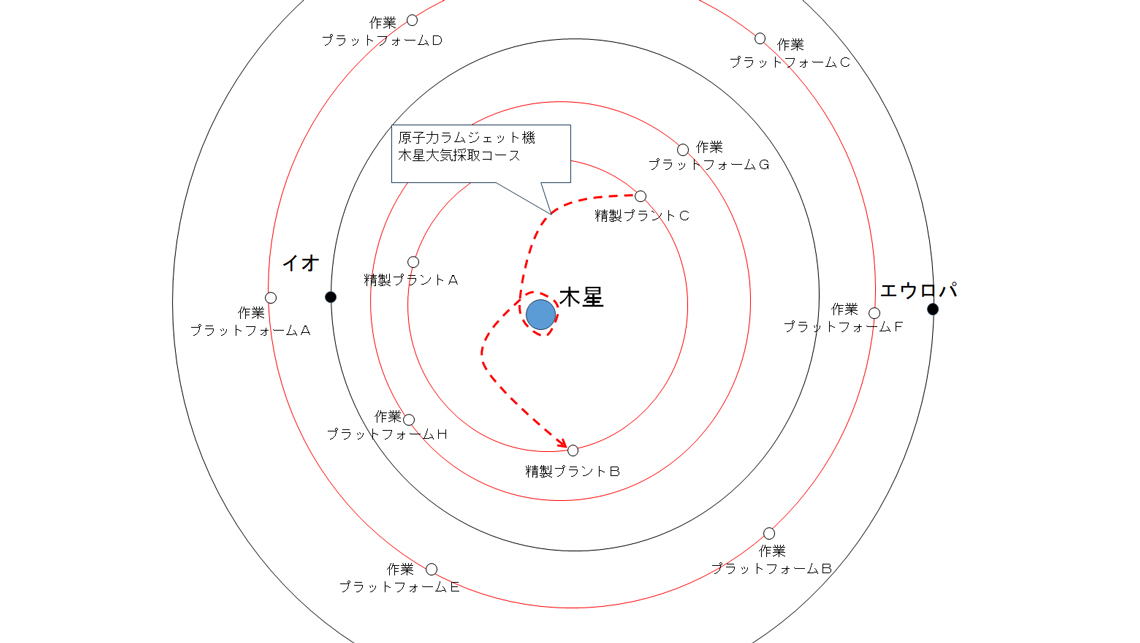 <イオ/エウロパ間> ●作業プラットフォームA/B/C 旅客輸送の中継地、および貨物輸送の中継地としての機能を担うものである。 精製プラントから輸送されてきた、ヘリウム3/水素のカートリッジコンテナを集結とタンカーへの搭載、 地球含めた他の惑星から到着した旅客船/貨物船の受け入れとメンテナンス、他の惑星へ向けての出発の管理を行う。 3基の作業プラットフォームは互いに連携し、木星周回軌道上の宇宙船の交通整理を行う。 ●作業プラットフォームD/E/F 作業プラットフォームA/B/Cを補完するもの。A/B/Cより多少規模は小さいが旅客輸送および貨物輸送の中継地の機能を担う。 また、3基の作業プラットフォームは互いに連携し、木星周回軌道上の宇宙船の交通整理を行う。 6基の作業プラットフォームは、同じ木星周回軌道上を周回し、木星を中心とし互いに60度離れた場所に位置する。 <木星/イオ間> ●作業プラットフォームG/H イオからさらに木星に近いところを周回する。旅客機能はなく、貨物輸送の中継地の機能を担う。 また、3基の精製プラントに不具合が発生した場合、メンテナンス作業要員はここから精製プラントへ向かう。 ●精製プラントA/B/C 作業プラットフォームG/Hからさらに木星に近いところを周回する。 原子力ラムジェット機の出発/受け入れ/メンテナンスの機能を担う。 3基の精製プラントは、同じ木星周回軌道上を周回し、木星を中心とし互いに120度離れた場所に位置する。 参考までに、原子力ラムジェット機の出発木星上層大気からの大気採取、精製プラントへの帰還コースを示す(赤点線) 出発した精製プラントと、大気採取後に帰還する精製プラントは異なり、原子力ラムジェット機は、3基の精製プラント間を常に行き来するコースを辿る。 |