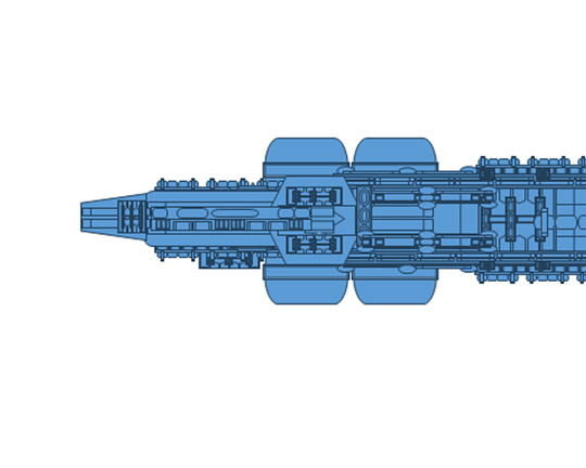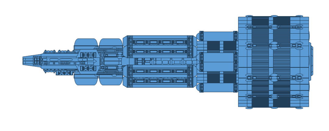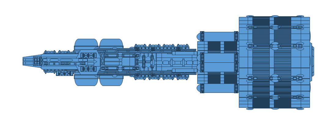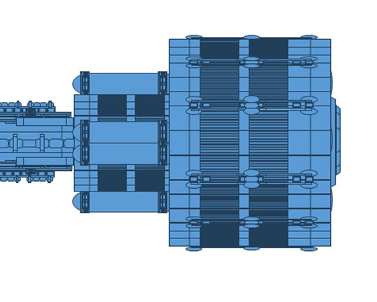 <兵装/作業/動力/推進装置区画> ●兵装区画 ・武器弾薬庫/戦闘服保管庫/メンテナンス室 ・エアロック ・ドッキング用通路 ・高出力レーザー砲 ・ミサイル発射装置 ●作業区画 ・機器メンテナンス室 ・屋外作業室 ・エアロック ●動力区画 ・核融合炉 ・ラジエーターパネル ・荷電粒子保護用磁気シールド ●推進装置区画 ・ヘリウム3、重水素貯蔵タンク ・核融合推進システム ・大気ブレーキ用シールド |