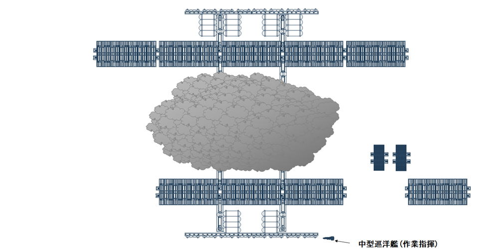 | <事前準備> ●期間 2083年4月 ~ 2085年4月> ●実施概要 ・太陽/地球L3への小惑星(シリコン/金属系小惑星)の曳航 ・電力供給用インフラの構築(太陽光発電パネルモジュール、電力供給用パイプスペースモジュール) ・核融合燃料(ヘリウム3/重水素)貯蔵タンクの設置、輸送用タンカー接岸用プラットフォームの設置 ・完了後、「Metal-Seed」システムを小惑星内に設置し、起動 ※下に見える小さな船は、作業指揮を行う中型巡洋艦「ハドソン・ベイ」である |