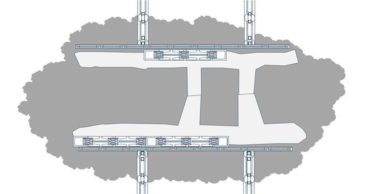 <宇宙船建造中/その4> ●期間 2086年11月 ~ 2088年9月 ●実施概要 ・部品製造用プラントの稼働 ・部品組み立て ・鉱山の稼働 ※図は、2088年6月の状態 後部船体完成 中央部船体完成 管理区画建造中 |