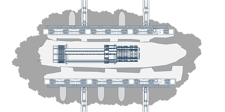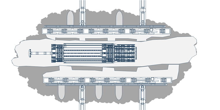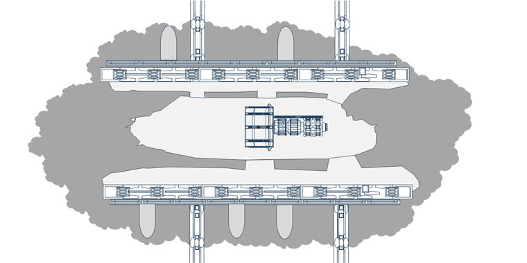 <宇宙船建造中/その1> ●期間 2086年11月 ~ 2088年9月 ●実施概要 ・部品製造用プラントの稼働開始 ・部品組み立て ・建造ドックの拡張 ・鉱山の掘削開始/鉱山の稼働 ※図は、2087年2月の状態 後部船体/核融合炉/推進システム建造中 |