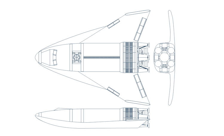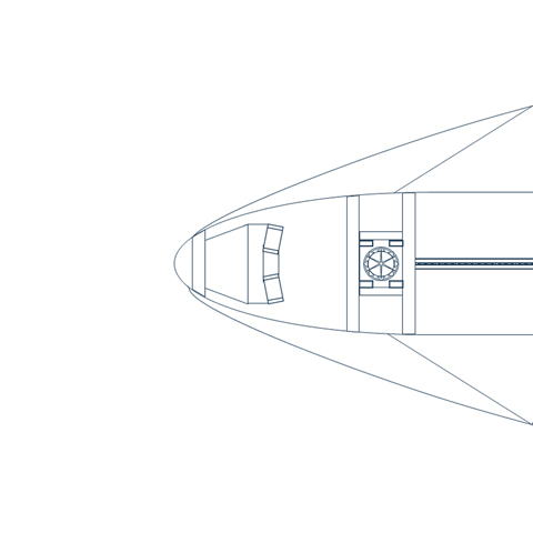 <後部船体> ●動力装置 ・動力制御システム ・超小型原子炉ユニット ・ラジエーターパネル ●貯蔵タンク ・酸素/水素/メタン貯蔵タンク ・水貯蔵タンク ●推進装置 ・酸素/メタン推進システム ・大気圧縮用コンプレッサー ・ターボジェットエンジン ・着陸用脚 ●リフティングボディ翼 |