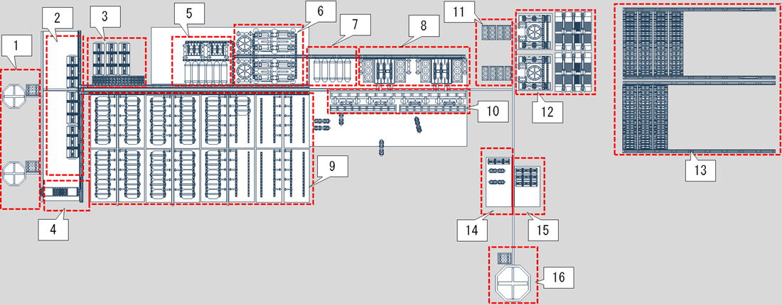 9.ガス貯蔵タンク(ヘリウム3/水素/メタン/CO2等)群 10.月土壌受け入れヤード、月土壌粉砕装置 11.変電設備 12.発電用原子炉モジュール(原子炉/タービン発電機/ラジエーターパネル) 13.発電用ソーラーパネル 14.月土壌運搬用重機のメンテナンス/充電設備 15.Heavy-Lifter用管制設備 16.Heavy-Lifter離着陸用パッド |