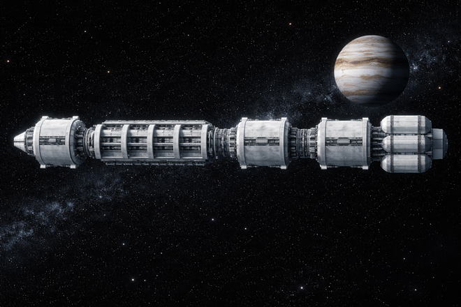 船体中央の旅客用モジュールは直方体の形でイメージしてましたが、出来上がった画像では円筒形になってしまいましたね。