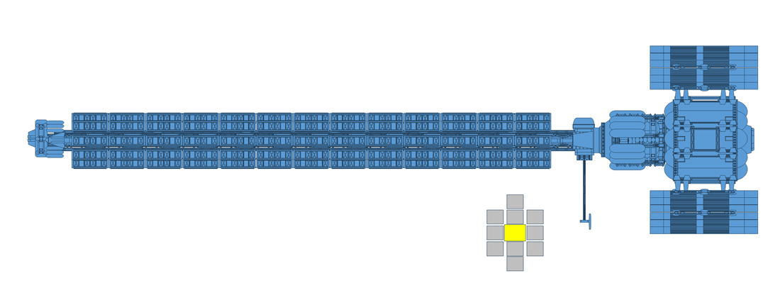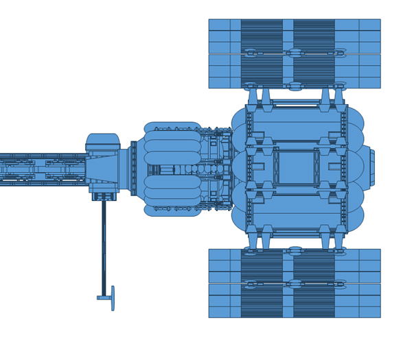 <貯蔵タンク/動力/推進システム区画> ●貯蔵タンク ・酸素/水素タンク ・ヘリウム3/重水素タンク ・水貯蔵タンク ●動力区画 ・核融合炉 ・ラジエーターパネル ・荷電粒子保護用磁気シールド ●推進システム区画 ・核融合クラスター推進システム:4基 |