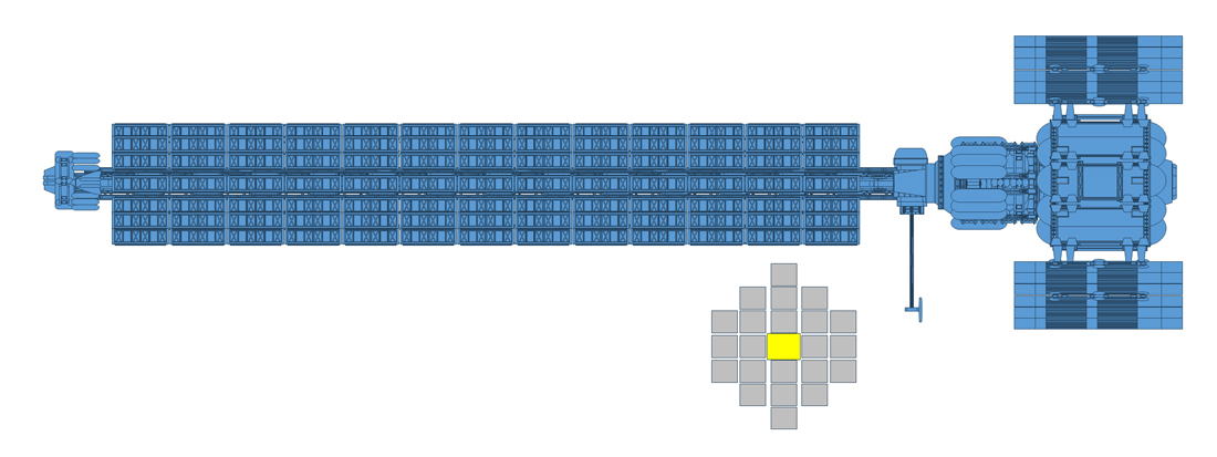 (宇宙船の図の下に、1つのユニットを前面から見た時のコンテナ接続構成を記載。黄色部分がユニットで、灰色部分がコンテナ)