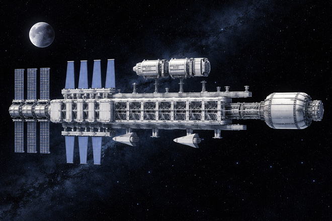 地球/月L2作業ステーションの想像図をChatGPTで作成してみました。