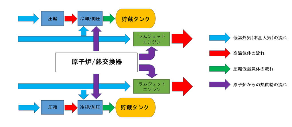 | <各サブシステムの動作/連携について> ●大気採取・保管モジュール 翼前縁部のエアインテイクから大気を取り入れ、ノズル状のコンプレッサーで高速圧縮する。 圧縮された大気は、別途取り入れた大気(圧縮大気と比較して低温)で冷却、原子炉の熱供給で動作するターボポンプでさらに加圧し、 機体内部のタンクに貯蔵する。 ●ラムジェットエンジン 機体下部のエアインテイクから大気を取り入れ、ノズル状のコンプレッサーで高速圧縮する。 原子炉から供給される熱で圧縮した大気をさらに高温に加熱、機体後方へ噴射することで推力を発生させる。 なお、木星上層大気から脱出し上昇する際には、外気の取り入れを徐々に減らし、機体内部タンク内の推進剤を使用し推力を発生させる。 ●原子炉/熱交換器 大気採取・保管モジュール、ラムジェットエンジンに高温の熱供給を行う。 動作中は、ほぼ熱暴走寸前の状態であるため、メルトダウンすることがないよう制御されている。 |