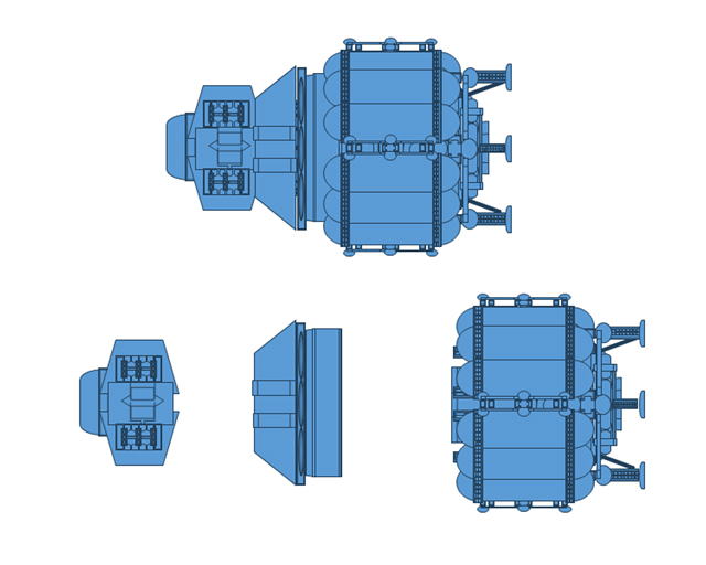 ●指令モジュール ・コクピット、制御システム ・ドッキング用通路 ・制御システム ・エアロック ●居住モジュール ・個室、ベッド等 ・食堂/キッチン、食料倉庫 ・ユニットバス、トイレ ●動力/推進モジュール ・水、空気リサイクルシステム ・バッテリー、発電機 ・酸素/水素/メタン貯蔵タンク ・水貯蔵タンク ・超小型原子炉モジュール ・酸素/メタン推進システム ・着陸用脚 |