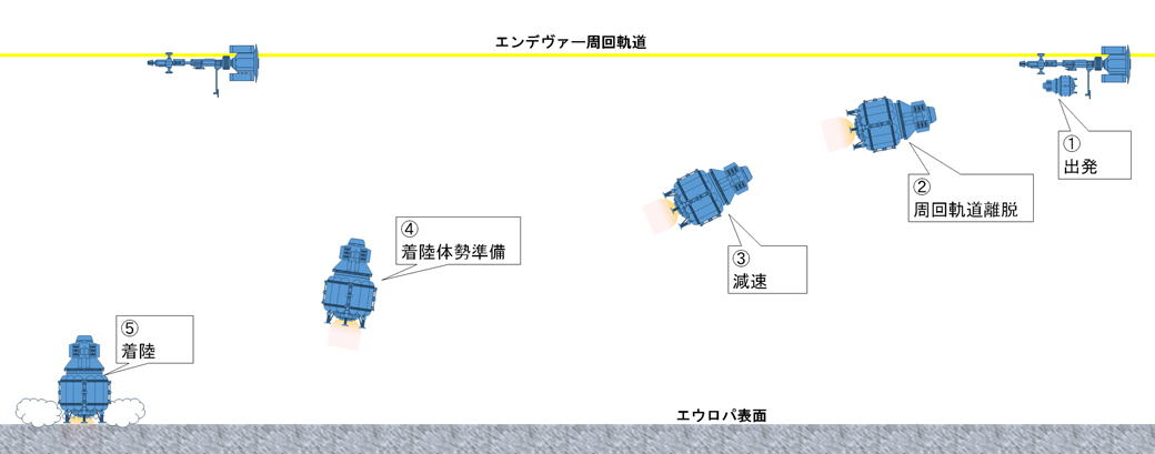 | <エウロパ着陸までの飛行コース> 1.出発 「エンデヴァー」を出発したのち、着陸船は逆噴射を行いエウロパ表面に向けて降下する。 2.周回軌道離脱 エウロパを周回する起動を離脱し、自由落下飛行コースに入る 3.減速 推進システムをさらに噴射し、ほぼ垂直にゆっくりと落下する 4.着陸体制準備 エウロパ表面が近くなると機体を垂直にした着陸体勢に入る 5.着陸 推進システムを使用し、垂直に着陸する |