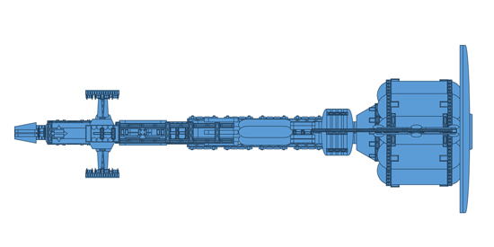 <探査船「エンデヴァー」> 当計画の中心となる宇宙船 核融合推進システムを搭載した宇宙船のプロトタイプ 全長:320m 総重量:7,800,000kg(7,800トン) 乗組員:12名 最大速度:250km/s |