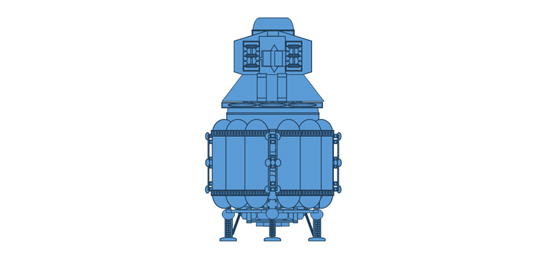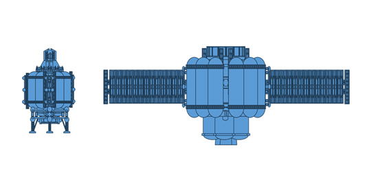 <小型着陸船(3人乗りSSTO)> 大気のない天体に着陸し調査を行う、3人乗り小型宇宙船 木星の衛星エウロパ/ガニメデの調査を想定したもの 全長:6m 全幅:6m 全高:12m 総重量:31,500kg(31.5トン) |
