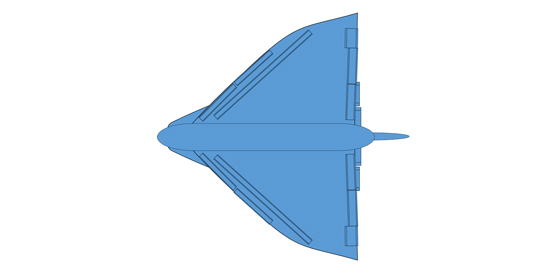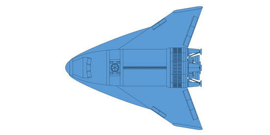 <小型着陸船(3人乗りリフティングボディSSTO)> 大気のある天体に着陸し調査を行う、3人乗り小型宇宙船 土星の衛星タイタンの調査を想定したもの 全長:20m 全幅:14m 全高:10m 総重量:38,500kg(38.5トン) |
