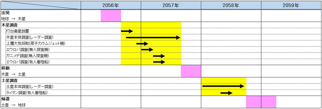 将来の核融合資源開発のための木星の調査、資源利用のための衛星の調査、木星/土星のフィールドでの各種技術試験等、