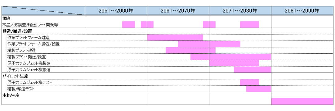 以下に、2060年代の調査段階から事業が本格的に稼働を始める2080年代までの事業化スケジュール(概要)を示す。