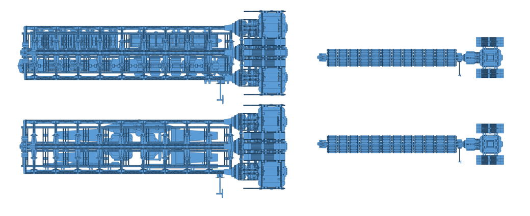 以下の図は、作業プラットフォームおよび精製プラントを木星へ向けて搬送する資材輸送用超大型キャリアー、および輸送用キャリアーの推進剤を
