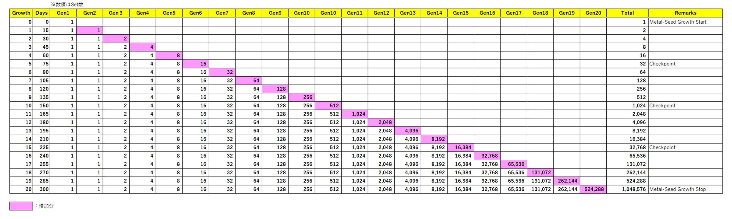 「Metal-Seed」は3つのノードで構成(セットと呼びます)され、1つのセットが次の1つのセットを製造し増殖する単位を世代と呼びます。