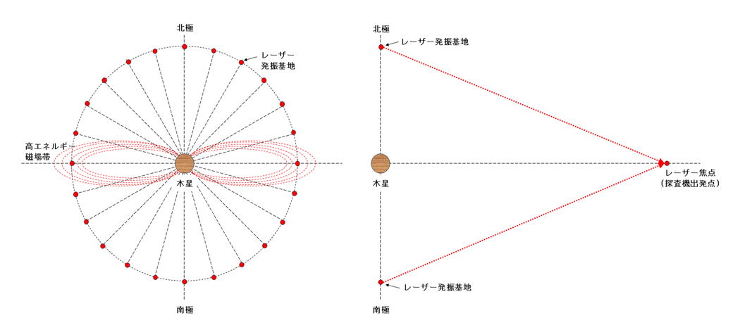 レーザー発振基地は合計24基。木星の極軌道を周回中、木星の高エネルギー磁場帯を横切る際に発電を行い、